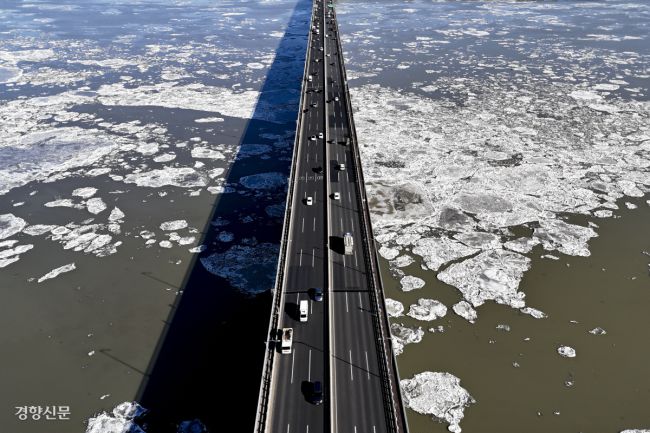 연일 매서운 한파가 몰아치고 있다. 22일 경기 김포시 일산대교 일대 한강 위에 유빙이 떠다니고 있다. 문재원 기자 mjw@kyunghyang.com ▶ 매일 라이브 경향티비, 재밌고 효과빠른 시사 소화제! ▶ 더보기|이 뉴스, 여기서 끝나지 않습니다 → 점선면 ©경향신문(www.khan.co.kr), 무단전재 및 재배포 금지