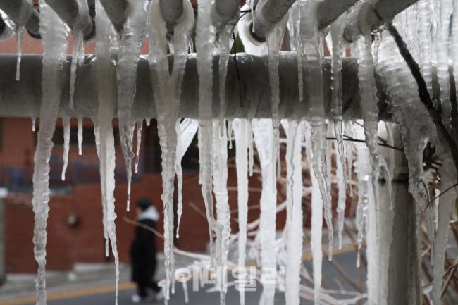 연일 한파가 이어지고 있는 23일 오후 서울 강남구 언주로의 한 주택가에 배수관이 동파돼 고드름이 얼어붙어 있다.