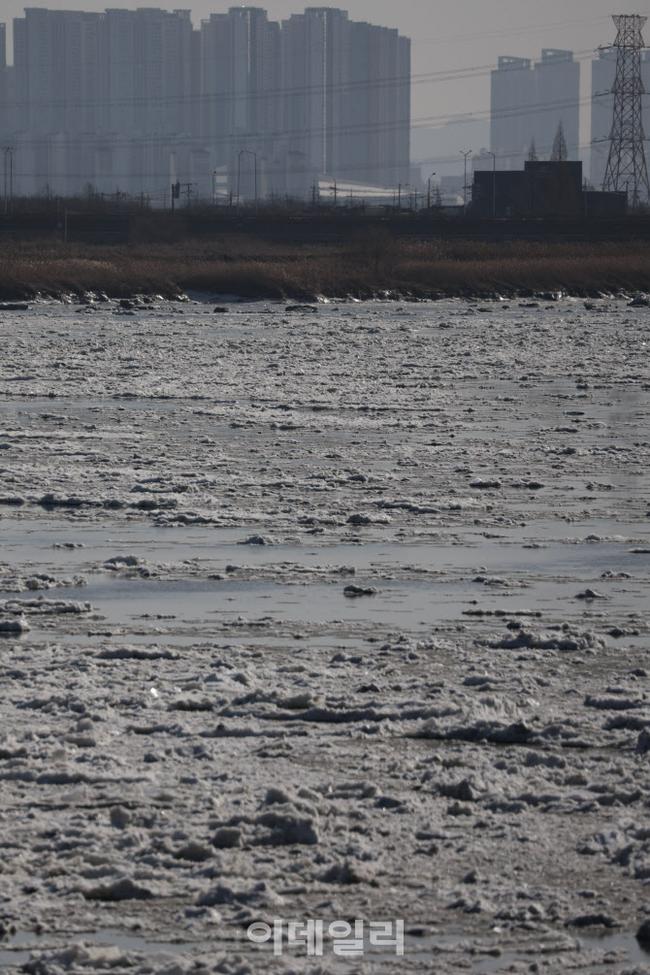 연일 한파가 이어지고 있는 25일 경기 김포시 일산대교 일대 한강에 유빙이 떠다니고 있다.