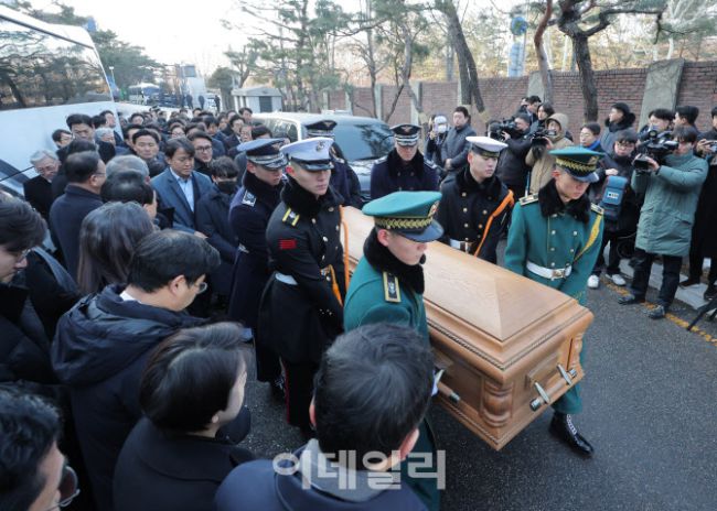 베트남 출장 중 심근경색으로 쓰러져 별세한 이해찬 민주평화통일자문회의 수석부의장의 시신이 27일 서울 종로구 서울대병원 장례식장으로 운구 되고 있다.
