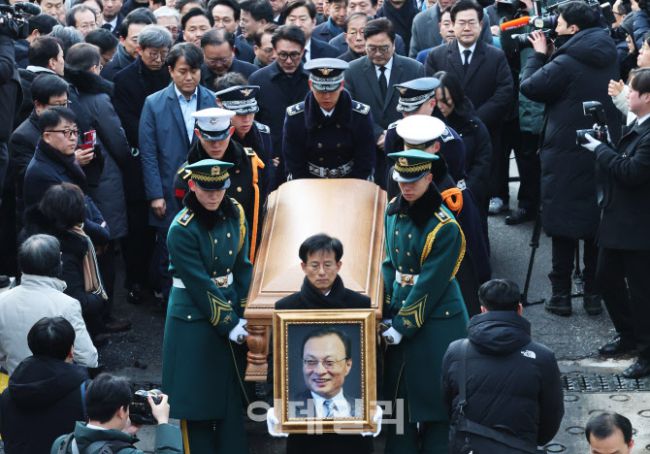 베트남 출장 중 심근경색으로 쓰러져 별세한 이해찬 민주평화통일자문회의 수석부의장의 시신이 27일 서울 종로구 서울대병원 장례식장으로 운구 되고 있다.