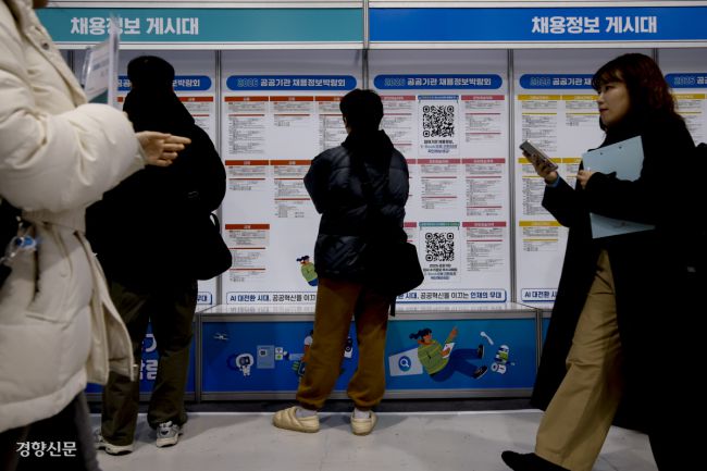 27일 서울 서초구 양재aT센터에서 열린 2026 공공기관 채용정보 박람회를 찾은 시민들이 채용정보를 살펴보고 있다. 문재원 기자 mjw@kyunghyang.com ▶ 매일 라이브 경향티비, 재밌고 효과빠른 시사 소화제! ▶ 더보기|이 뉴스, 여기서 끝나지 않습니다 → 점선면 ©경향신문(www.khan.co.kr), 무단전재 및 재배포 금지