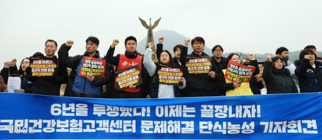 공공운수노조 국민건강보험 고객센터지부 노조원들이 11일 청와대 분수대 앞에서 ‘정규직 전환 즉각 이행’을 촉구하는 단식 농성 돌입 기자회견을 하고 있다. 건보공단은 문재인 정부의 공공부문 정규직 전환 정책에 따라 2021년 10월 소속기관을 신설해 고객센터 노동자들을 고용하는 방식으로 정규직 전환을 하겠다고 했지만 전환 대상과 노동조건 등을 둘러싼 이견 때