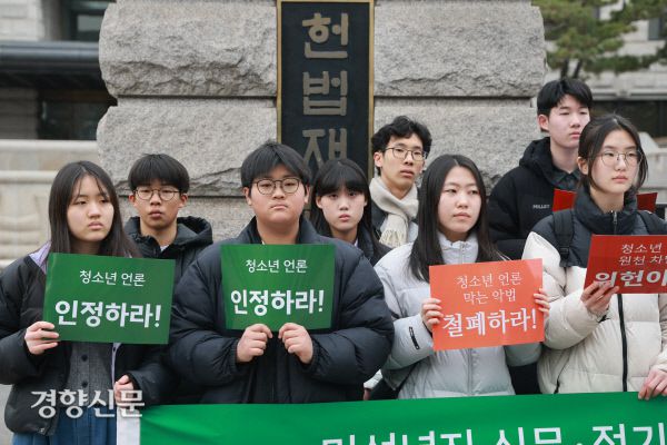 24일 서울 종로구 헌법재판소 앞에서 청소년 독립언론 토끼풀 주최로 열린 신문법 잡지법 헌법소원 청구 기자회견에서 참가자들이 손피켓을 들고 청소년 언론 인정을 촉구하고 있다. 2026.2.24. 정지윤 선임기자 정지윤 기자 color@kyunghyang.com ▶ 매일 라이브 경향티비, 재밌고 효과빠른 시사 소화제! ▶ 더보기|이 뉴스, 여기서 끝나지 않습
