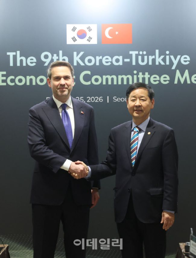 구윤철 경제부총리 겸 재정경제부 장관(오른쪽)과 알파슬란 바이락타르 튀르키예 에너지천연자원부 장관이 25일 서울 중구 더플라자에서 열린 ‘제9차 한-튀르키예 경제공동위’에서 인사를 나누고 있다.