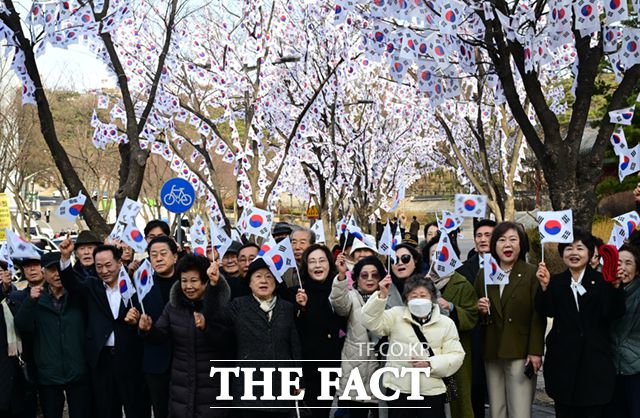 박희영 용산구청장과 보훈가족들이 27일 서울 용산구 효창공원 내 의열사 참배를 마친 뒤 태극기거리를 행진하며 만세삼창을 외치고 있다. 이날 행사에는 박희영 용산구청장과 광복회 용산구지회장, 용산구 보훈단체지회장 등 보훈가족 100여 명이 참석해 애국선열들을 추모·참배한 뒤 만세삼창을 외쳤다. 용산구는 지난 21일부터 3월 8일까지 지하철 6호선 효창공원앞역