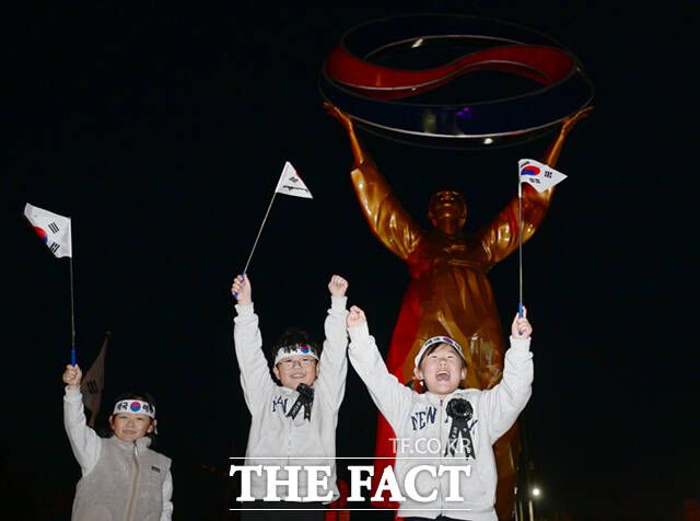 107주년 3.1절을 하루 앞둔 28일 오후 충남 천안시 동남구 유관순 열사 사적지 일대에서 2026 아우내봉화제가 열린 가운데, 어린이들이 유관순 동상 앞에서 만세삼창을 외치고 있다. 아우내봉화제는 호서지방 최대 규모였던 아우내 독립만세운동을 기념하고, 유관순 열사와 순국선열들의 나라사랑 정신을 계승하기 위해 마련됐다. 이날 참가자들은 대형 태극기를 앞세