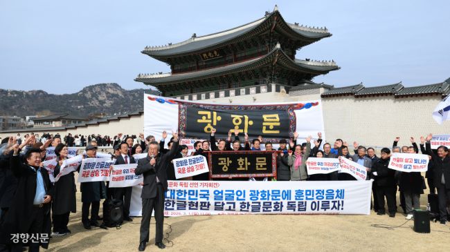 광화문 훈민정음체 한글 현판 국민 모임 회원들이 1일 서울 광화문광장에서 기자회견을 열고 광화문 한글 현판 모형을 공개하고 있다. 정효진 기자 hoho@kyunghyang.com ▶ 매일 라이브 경향티비, 재밌고 효과빠른 시사 소화제! ▶ 더보기|이 뉴스, 여기서 끝나지 않습니다 → 점선면 ©경향신문(www.khan.co.kr), 무단전재 및 재배포 금지