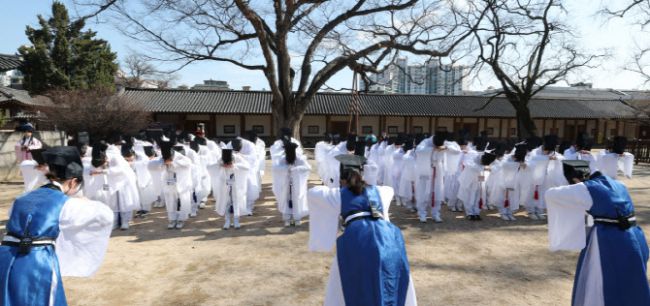8일 서울 종로구 성균관 문묘에서 열린 2026 신방례(신입생 환영회)에서 유생 의복을 입은 성균관대학교 신입생들이 공자를 비롯한 유교 성현들에게 인사를 올리는 알묘를 하고 있다. 신방례는 조선시대 과거에 합격한 유생들을 위한 환영식이자 선배들이 신입 유생을 맞이하는 일종의 통과의례이다. 8일 서울 종로구 성균관 문묘에서 열린 2026 신방례(신입생 환영회