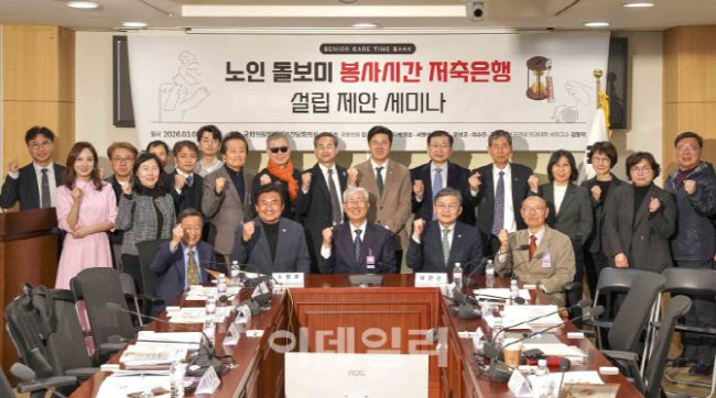 김동익 성균관대학교 의과대학 석좌교수가 지난 5일 국회의원회관에서 ‘노인 돌보미 봉사시간 저축은행(Senior Care Time Bank, SCTB) 설립 제안 세미나’를 개최하고 참석자들과 기념촬영을 하고 있다. 세미나는 급격한 고령화로 심화되는 노인 돌봄 인력난과 돌봄 공백 문제를 해결하기 위해 50~60대 퇴직·은퇴 세대의 비경제활동 시간을 사회적 자