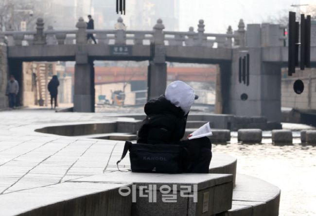 꽃샘추위를 보인 10일 서울 청계천에서 한 시민이 책을 읽고 있다. 이날 서울 최저기온은 영하 1도를 나타냈으며 한낮 최고기온은 영상 9도로 예상된다. 미세먼지 농도는 전국 대부분 지역에서 ‘보통’ 수준이다.