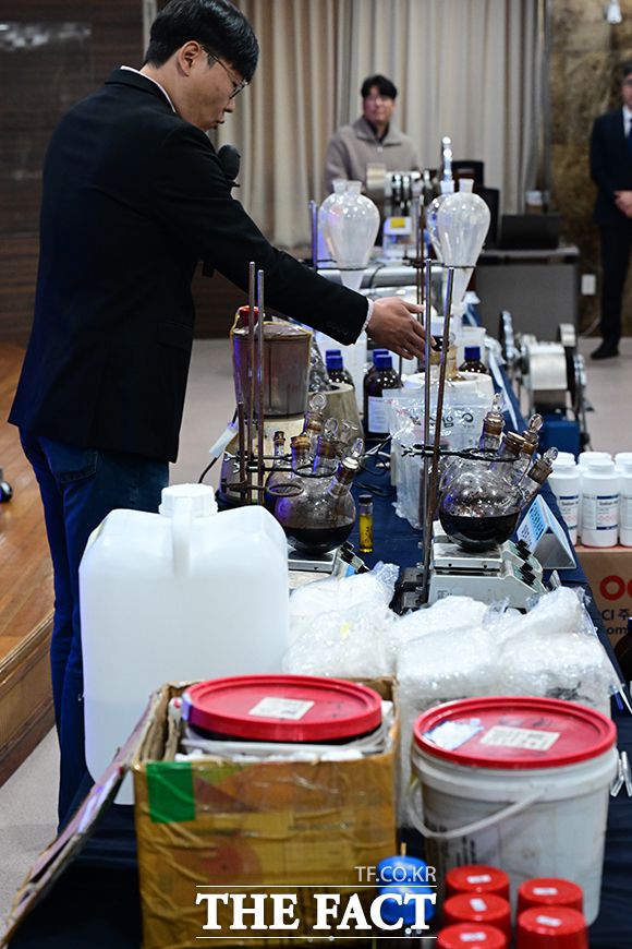 장성화 인천공항본부세관 마약조사2과 주무관이 17일 오전 인천 중구 인천공항본부세관 수출입통관청사에서 열린 마약 MDMA 제조 시설 적발·압수 및 유통일당 검거 브리핑을 하고 있다. 관세청 인천공항세관은 베트남발 항공특송화물을 이용해 마약류 원료물질을 밀수입한 뒤 국내에서 MDMA를 제조한 베트남 국적 마약조직원 3명을 검거해 검찰에 넘겼다. 이들 조직이