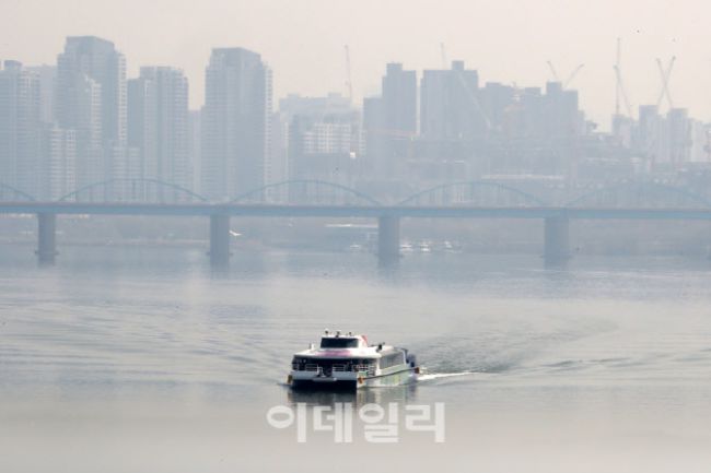 수도권 초미세먼지 비상저감조치가 시행된 17일 서울 한강에 한강버스가이동하고 있다. 한낮에 서울이 15도까지 오르고 수도권과 충청·호남권 등에선 미세먼지가 종일 ‘나쁨’ 수준이 예상된다.
