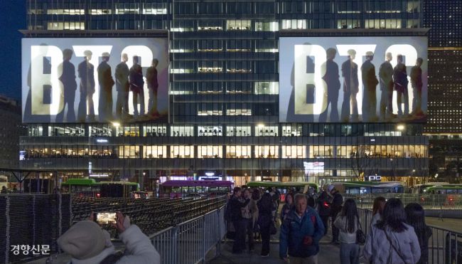 그룹 방탄소년단(BTS)의 컴백 공연을 이틀 앞둔 19일 공연 무대가 설치된 서울 광화문광장 맞은편 대형 전광판에 홍보 영상이 상영되고 있다. 문재원 기자 mjw@kyunghyang.com ▶ 매일 라이브 경향티비, 재밌고 효과빠른 시사 소화제! ▶ 더보기|이 뉴스, 여기서 끝나지 않습니다 → 점선면 ©경향신문(www.khan.co.kr), 무단전재 및 재