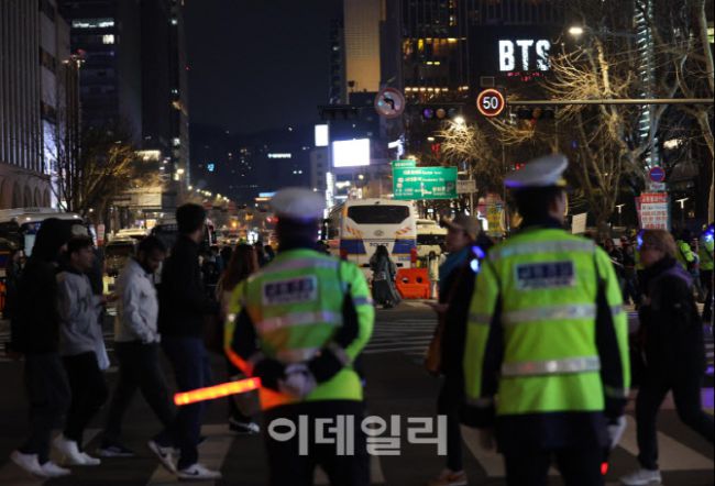 BTS(방탄소년단)의 컴백 공연이 마무리된 21일 서울 종로구 광화문 광장 인근에서 시민들과 팬들이 경찰과 안내 요원의 지시에 따라 이동하고 있다.