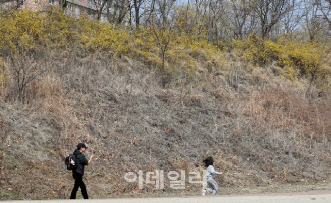 서울 여의도 샛강역 인근에 23일 봄꽃 개나리가 피어 있다. 이날 서울 지역 기온은 최저 4도, 최고 19도로 큰 일교차를 보이고 건조주의보가 발효된 가운데 수도권 미세먼지 농도는 나쁨 상태를 보이겠다.
