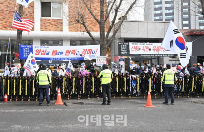 윤석열 대통령 탄핵 심판 선고를 앞둔 16일 서울 종로구 헌법재판소 앞에서 탄핵 반대 시위가 열리고 있다.