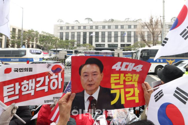 윤석열 대통령 탄핵 심판 선고가 임박한 18일 서울 종로구 헌법재판소에서 시민들이 탄핵 반대 시위를 하고 있다.