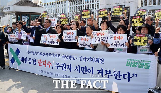 윤석열즉각퇴진·사회대개혁 비상행동이 24일 오후 서울 종로구 정부서울청사 앞에서 한덕수 권한대행 탄핵심판 결과에 대한 비상행동 입장 발표 기자회견을 열고 한 권한대행의 사퇴를 촉구하고 있다. 이들 단체는 기자회견에서 "내란세력을 비호한 한 총리에 대해 제대로 책임을 묻지 않은 기각 결정을 강력히 규탄한다"고 밝혔다. darkroom@tf.co.kr 사진영상