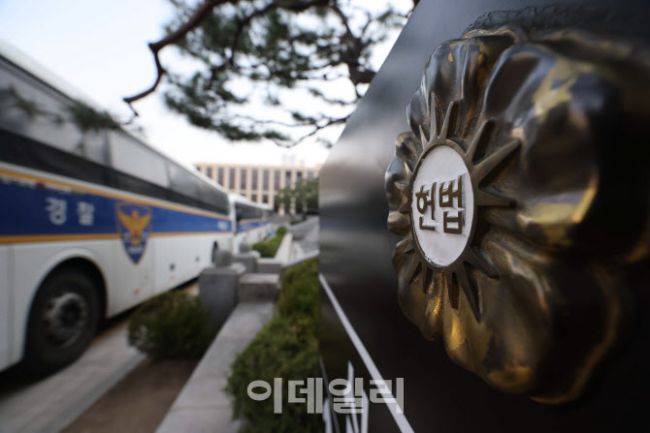 윤석열 대통령 탄핵심판 선고기일이 4일 오전 11시로 지정됐다. 1일 오후 서울 종로구 헌법재판소 내부에 경찰버스 차벽에 세워져 있다. 경찰은 1일 오후부터 헌법재판소 부근 200m 이내 도로를 통제하며 진공상태화 조기 착수에 들어갔다.