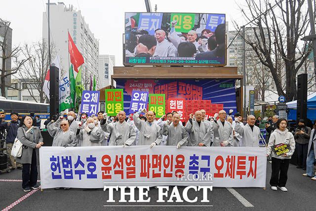 대한불교조계종 사회노동위원회·범불교시국회의 스님들이 2일 오전 서울 종로구 조계사에서 윤석열 대통령 파면과 인용을 촉구하며 헌법재판소를 향해 오체투지를 마친 뒤 구호를 외치고 있다. j3321362@tf.co.kr 사진영상기획부 photo@tf.co.kr 발로 뛰는 더팩트는 24시간 여러분의 제보를 기다립니다. ▶카카오톡: '더팩트제보' 검색 ▶이메일: j