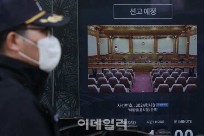 윤석열 대통령 탄핵심판 선고를 하루 앞둔 3일 서울 종로구 헌법재판소에 선고 관련 공지문이 나오고 있다.