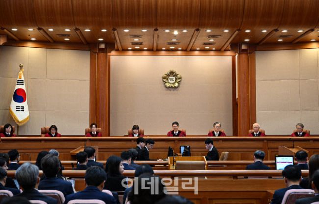 [사진공동취재단] 문형배 헌법재판소장 직무대행이 4일 오전 서울 종로구 헌법재판소 대심판정에서 윤석열 대통령 탄핵심판 선고를 하고 있다.