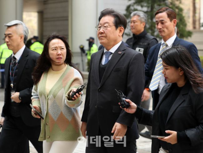[포토] 취재진 질문 속 출석하는 이재명 대표