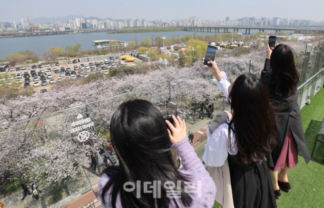 2025 여의도 봄꽃축제가 개막한 8일 오후 서울 영등포구 여의도 국회의 한 카페에서 시민들이 활짝 핀 벚꽃을 감상하고 있다.