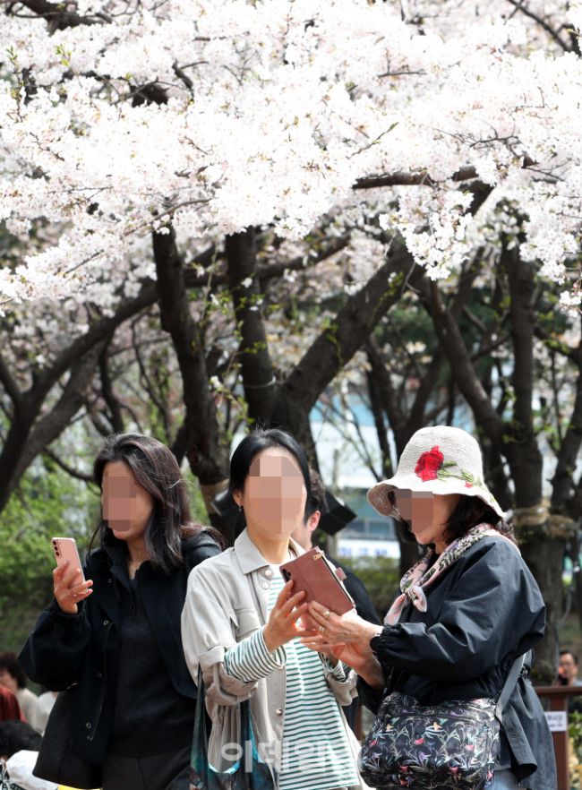 벚꽃이 만개한 9일 서울 송파구 석촌호수에서 시민들이 기념촬영을 하고 있다.