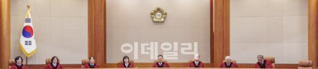 문형배 헌법재판소장 권한대행과 헌법재판관들이 10일 오후 서울 종로구 헌법재판소 대심판정에서 열린 4월 심판사건 선고에 참석하고 있다.