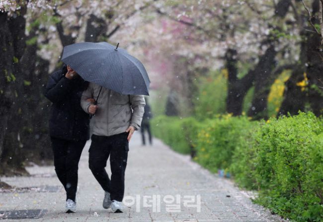여의도 봄꽃축제 마지막 날인 13일 오후 서울 영등포구 윤중로에서 시민들이 갑자기 내린 눈비에 우산을 쓰고 산책을 하고 있다.