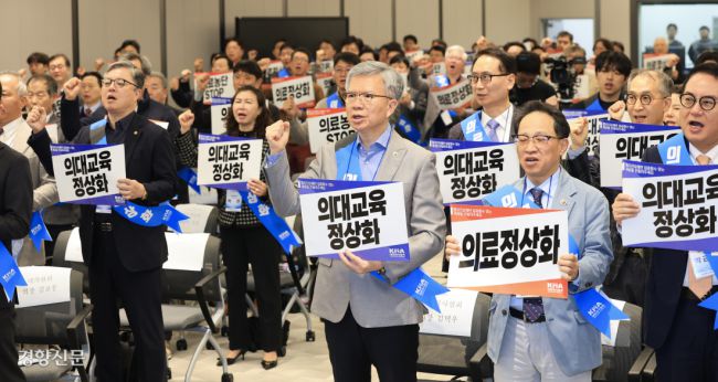 김택우 대한의사협회 회장(왼쪽)을 비롯한 대의원들이 13일 서울 용산구 의협회관에서 열린 ‘대선기획본부 출범식 및 의료정상화를 위한 전국의사대표자대회’에서 구호를 외치고 있다. 이준헌 기자 heon@kyunghyang.com ▶ 매일 라이브 경향티비, 재밌고 효과빠른 시사 소화제! ▶ 주 3일 10분 뉴스 완전 정복! 내 메일함에 점선면 구독 ©경향신문(w