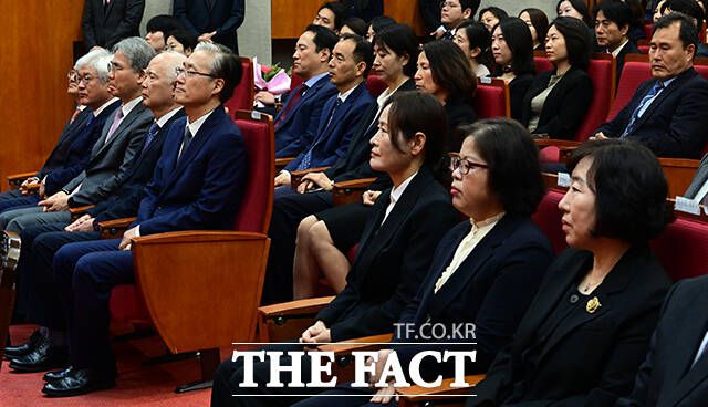 마은혁, 조한창, 정형식, 김형두, 정정미, 김복형, 정계선 헌법재판관(왼쪽부터)이 18일 오전 서울 종로구 헌법재판소에서 열린 문형배 헌법재판소장 권한대행과 이미선 헌법재판관의 퇴임식에 참석해 문 권한대행의 퇴임사를 듣고 있다. darkroom@tf.co.kr 사진영상기획부 photo@tf.co.kr 발로 뛰는 더팩트는 24시간 여러분의 제보를 기다립니다