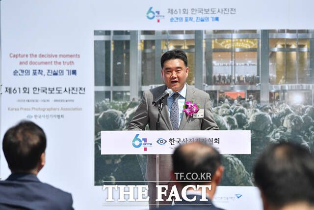 [더팩트ㅣ사진공동취재단] 이호재 한국사진기자협회장이 21일 서울 종로구 광화문 광장에서 열린 제61회 한국보도사진전 '순간의 포착, 진실의 기록' 개막식에서 인사말을 하고 있다. 올해 61회를 맞은 한국보도사진상 수상작 전시회는 전국 500여명의 사진기자들이 2024년 한 해 동안 정치·경제·사회·스포츠 등 각종 현장에서 치열하게 취재한 현장의 수많은 기록