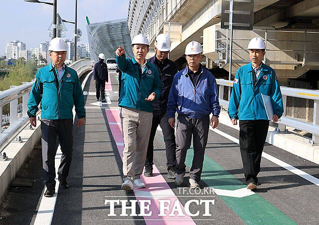 오언석 도봉구청장이 24일 동부간선도로(성수방면)~도봉역 방향 진출 연결로 개통 전 준공 상태 등을 확인하고 있다. /도봉구청 오언석 도봉구청장이 24일 막바지 공사를 끝낸 동부간선도로(성수방면)~도봉역 방향의 새 진출연결로(램프)를 찾았다. 본격적인 개통을 앞두고 도로 구조물의 안전성과 준공 상태를 최종 확인하기 위해서다. 이날 오 구청장은 현장에서 공사