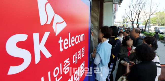 해킹 공격으로 가입자 유심 정보가 탈취된 SK텔레콤이 가입자 유심 무상 교체를 시작한 28일 오전 서울 강남구 T월드 본사 직영 대리점에 고객들이 줄지어 대기하고 있다. 전국 T월드 매장 2600여 곳과 공항 로밍센터에서 희망하는 고객들에게 순차적으로 유심 무상 교체를 진행하는 SK텔레콤은 현재 유심 100만 개를 확보했으며 5월 말까지 약 500만 개를