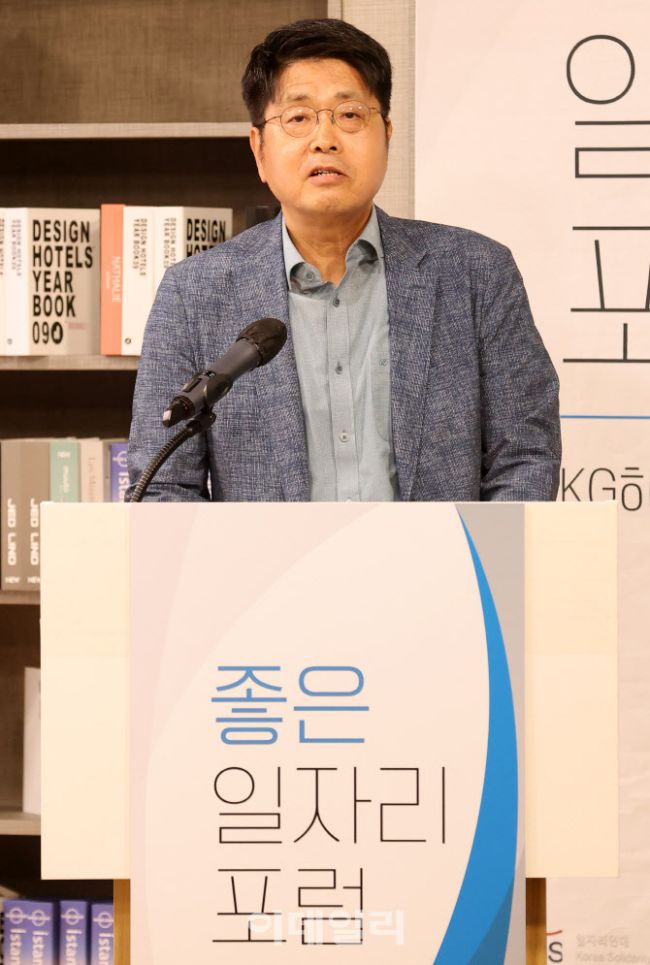 조준모 성균관대학교 경제학과 교수가 28일 서울 중구 KG타워에서 열린 '2025 좋은 일자리 포럼'에서 'AI시대 노동개혁 방향과 과제'란 주제로 기조발제를 하고 있다. 일자리연대와 이데일리·이데일리TV가 공동 개최한 '2025 좋은 일자리 포럼'은 급변하는 노동환경 속에서 지속 가능한 일자리를 어떻게 만들고 지켜나갈 것인지에 대한 사회적 해답을 모색하기