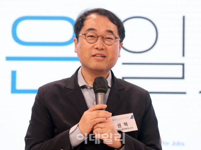 권혁 고려대 노동대학원 교수가 28일 서울 중구 KG타워에서 열린 '2025 좋은 일자리 포럼'에서 패널들과 토론을 하고 있다. 일자리연대와 이데일리·이데일리TV가 공동 개최한 '2025 좋은 일자리 포럼'은 급변하는 노동환경 속에서 지속 가능한 일자리를 어떻게 만들고 지켜나갈 것인지에 대한 사회적 해답을 모색하기 위해 마련됐다.