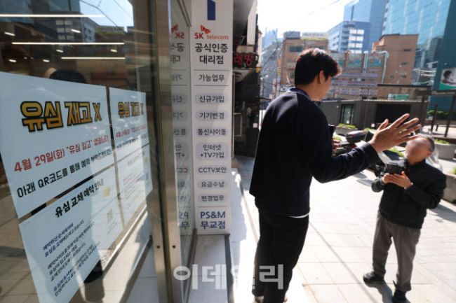29일 오전 서울 시내 한 SKT 대리점에 유심 교체를 하기 위한 이용자들이 매장 개장 시간에 앞서 담당자와 대화하고 있다. 해킹사고가 발생한 SKT는 사이버침해 피해를 막기 위해 28일 오전 10시부터 전국 2600여곳의 T월드 매장에서 희망 고객 대상 유심교체를 무료로 진행하기로 했다.