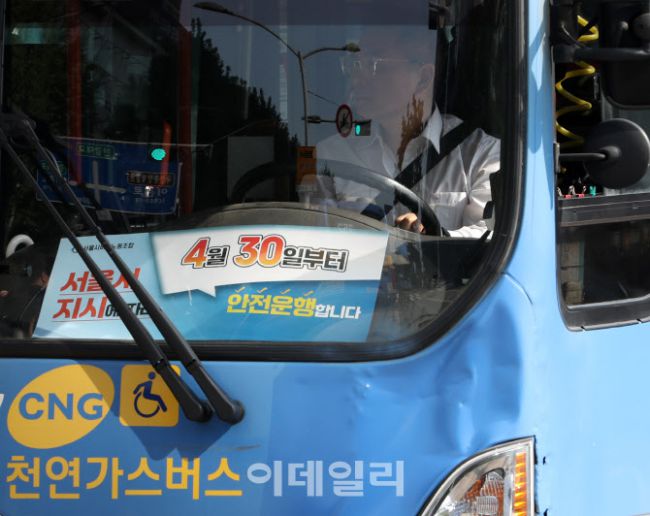 서울 시내버스 노사협상이 결렬된 30일 오전 서울 용산구 한강대로를 운행중인 버스에 준법투쟁 표식이 부탁되어 있다. 노사는 협상에서 합의점을 찾지 못했으며, 노조는 이날 새벽 첫차부터 준법투쟁(안전운행)에 돌입했다.