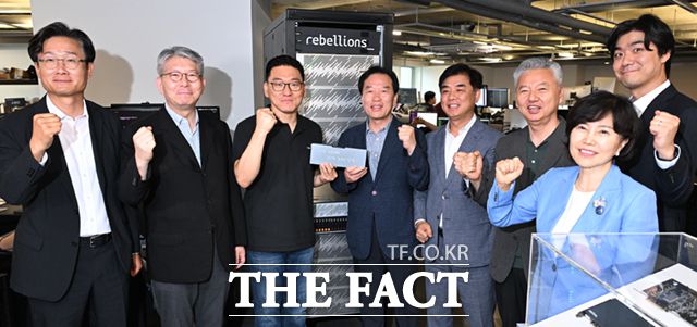 정태호 국정기획위원회 경제1분과 위원장(가운데)과 분과·전문위원들이 25일 오후 경기 성남시 분당구 AI반도체 스타트업 리벨리온 본사를 방문해 박성현 리벨리온 대표(왼쪽 세 번째)와 함께 지난 울산 데이터센터 출범식에서 이재명 대통령이 사인한 리벨리온 NPU 카드를 들고 기념촬영하고 있다. 국정기획위 경제 1분과·2분과는 이날 AI반도체 기업 리벨리온과 피