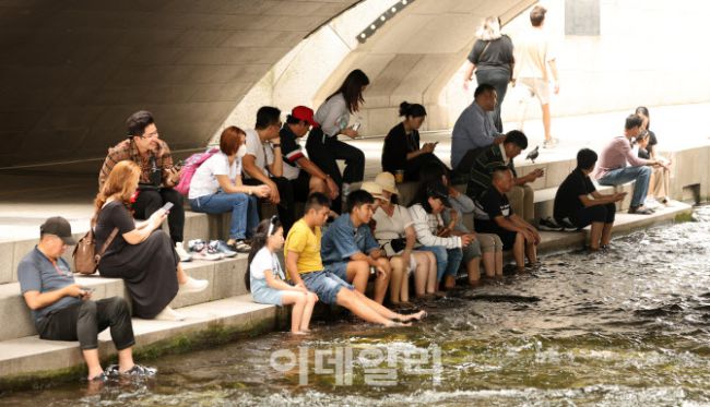 서울 전역과 경기 일부 지역에 폭염특보를 발효된 30일 서울 청계천을 찾은 시민들 및 외국인들이 다리 밑에서 청계천에 발을 담그며 더위를 잊고 있다.