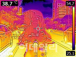 서울 낮 최고기온이 37도까지 오르며 폭염이 계속된 9일 오후 서울 마포구 신촌역 인근에서 열화상카메라로 촬영한 배달라이더의 모습. 아스팔트의 온도가 50도 이상을 나타내고 있다. 온도가 높을수록 붉게, 낮을수록 푸르게 나타난다.