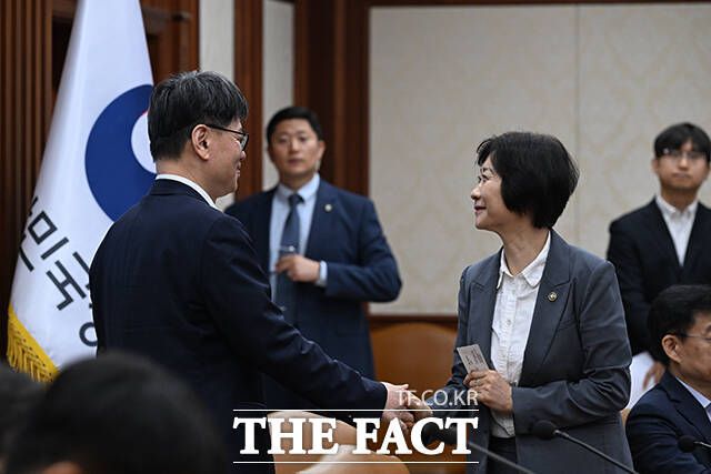 이스란 보건복지부 1차관(오른쪽)이 10일 오전 서울 종로구 정부서울청사에서 열린 국정현안관계장관회의에 참석해 회의 참석자들과 인사를 나누고 있다. darkroom@tf.co.kr 사진영상기획부 photo@tf.co.kr 발로 뛰는 더팩트는 24시간 여러분의 제보를 기다립니다. ▶카카오톡: '더팩트제보' 검색 ▶이메일: jebo@tf.co.kr ▶뉴스 홈페