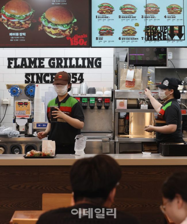내년 최저임금이 올해보다 2.9% 오른 시간당 1만320원으로 결정됐다. 이는 역대 정부 1년 차 최저임금 인상율 가운데 두 번째로 낮은 수준으로 2008년 이후 17년 만에 근로자·사용자·공익위원 합의로 결정됐다. 13일 오후 서울 서대문구의 한 패스트푸드점에서 일하는 직원의 모습.