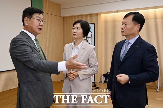 황영기 초록우산 회장과 이스란 보건복지부 제1차관, 이정복 한국서부발전 사장(왼쪽부터)이 16일 오전 서울 중구 초록우산어린이재단에서 열린 보건복지부와 한국서부발전, 초록우산이 함께 진행하는 'KOWEPO 청년자립플러스+' 업무협약 및 자문위원 위촉식에 참석해 대화를 나누고 있다. 'KOWEPO 청년자립플러스+'는 보호 종료 후 사회에 첫발을 내딛는 자립준