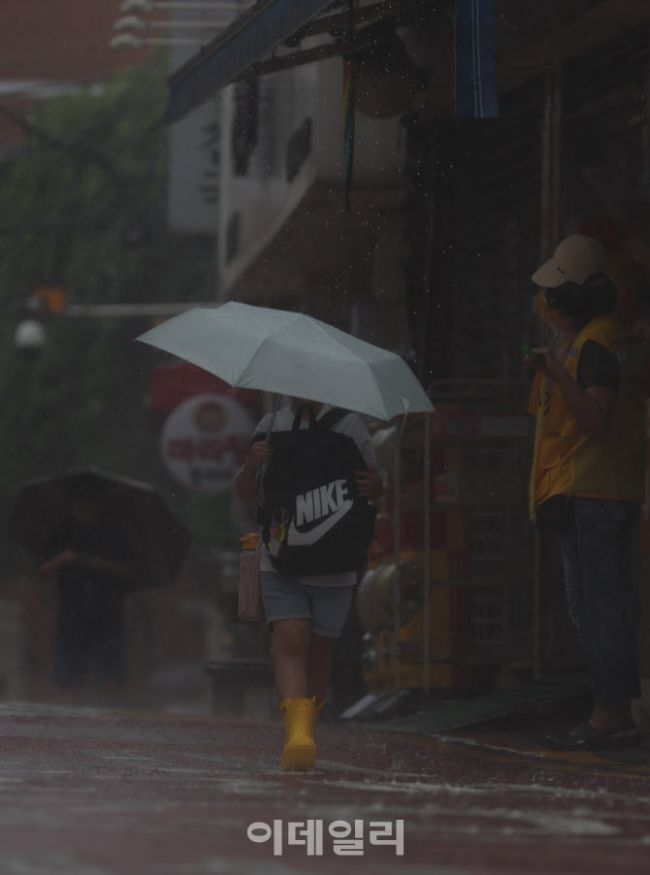 서울에 50∼150㎜ 폭우가 내린 17일 서울 관악구 신대방동 일대에서 한 학생이 우산을 쓴 채 하교하고 있다.