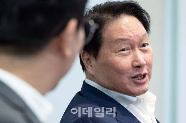 최태원 대한상공회의소 회장이 24일 오후 서울 중구 대한상공회의소에서 김영훈 고용노동부 장관과 대화하고 있다.