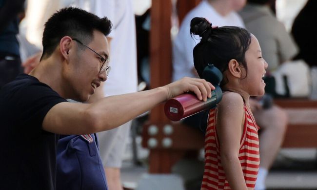 전국 대부분 지역에 폭염경보가 발효된 27일 오후 서울 종로구 광화문광장에서 한 시민이 딸에게 보온병에 있는 차가운 물을 부어주고 있다. 김혜윤 기자 unique@hani.co.kr 전국에 폭염특보가 발효되고 열대야가 곳곳에서 이어지며 무더위가 계속된 27일 서울과 강원 일부지역 최고기온은 38도, 경기 가평 39.1도 등 경기 다수 지역은 40도에 가까운